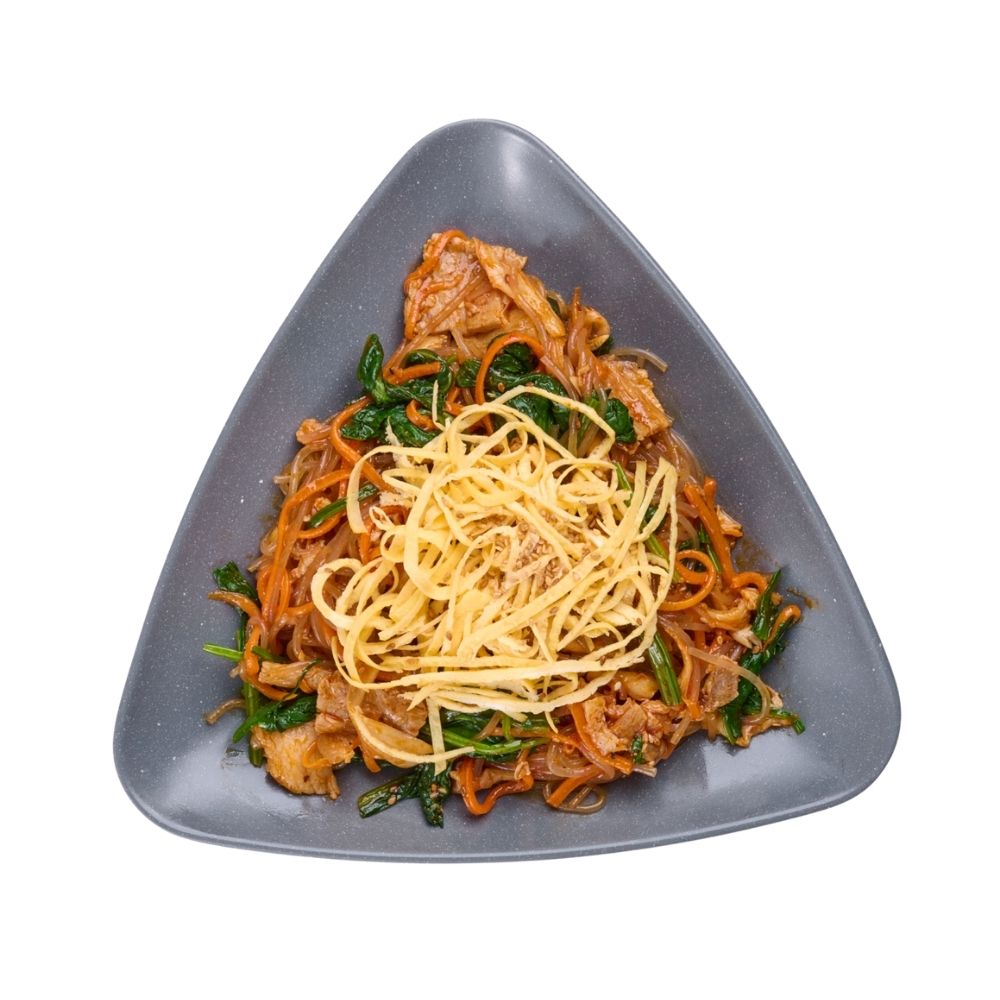 Miến Japchae cay được kết hợp chung với cà rốt, dưa leo, rau bina, nấm,…